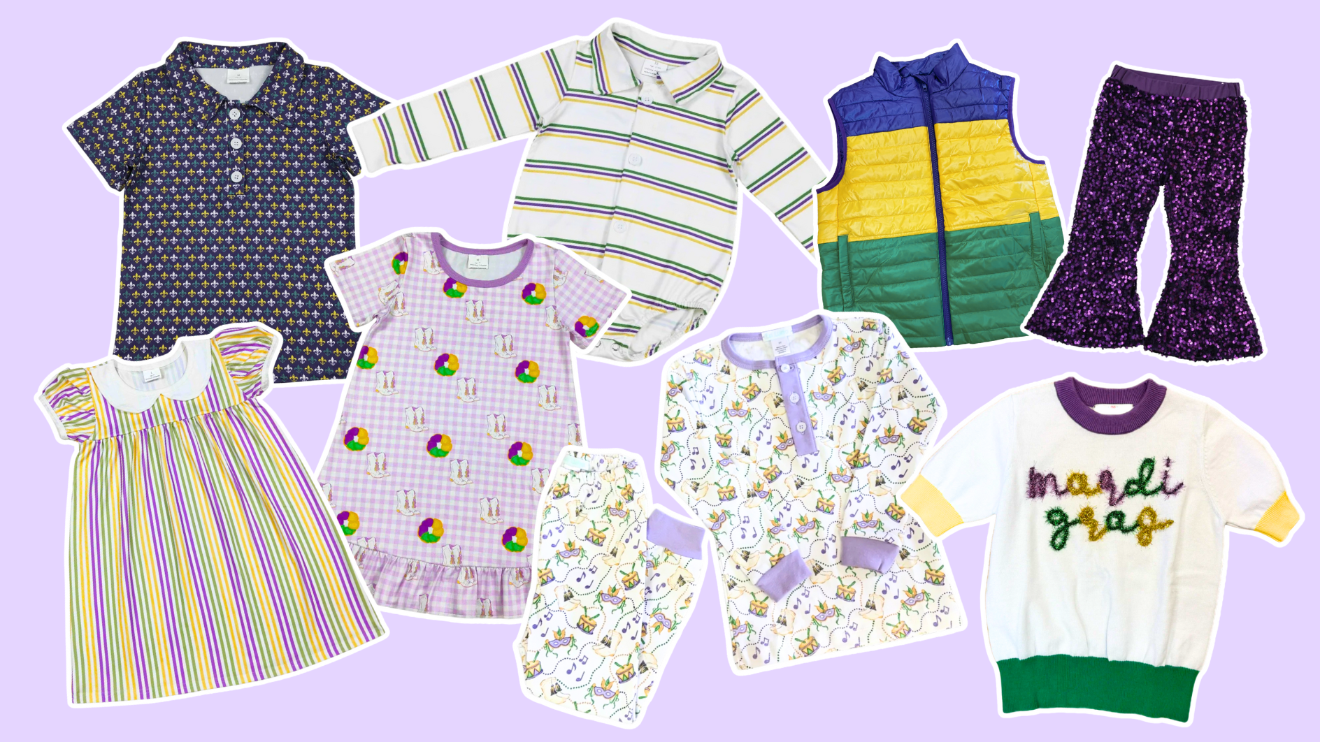Celebrate Mardi Gras with children’s outfits full of purple, green, and gold made for parades, parties, and picture-perfect moments.