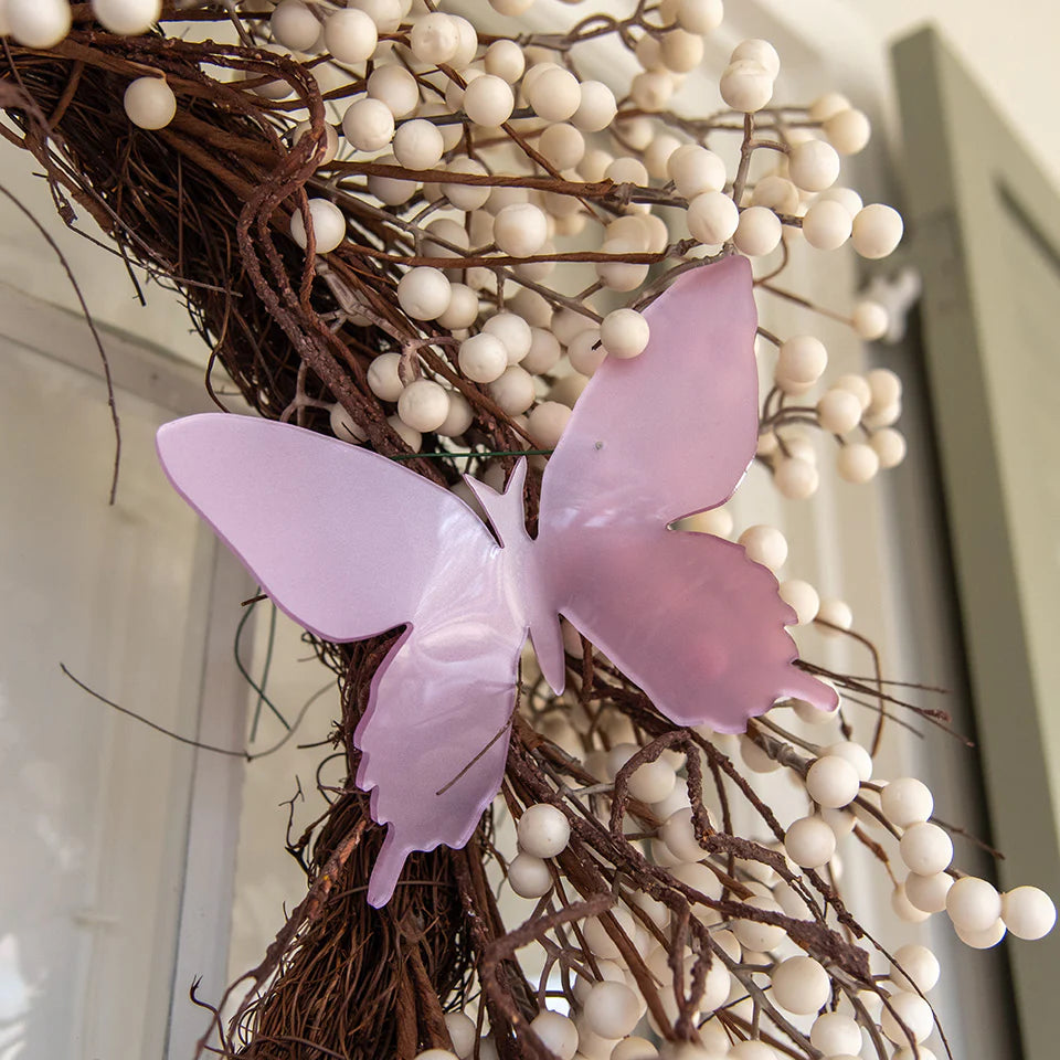 Available in three cheerful colors and two sizes, each acrylic butterfly is a hand-crafted piece of art. Use the nickel hook to hang your butterfly on a wreath, or floral arrangement. Easily remove the nickel hook and use your butterfly to decorate table settings or as wall decoration.