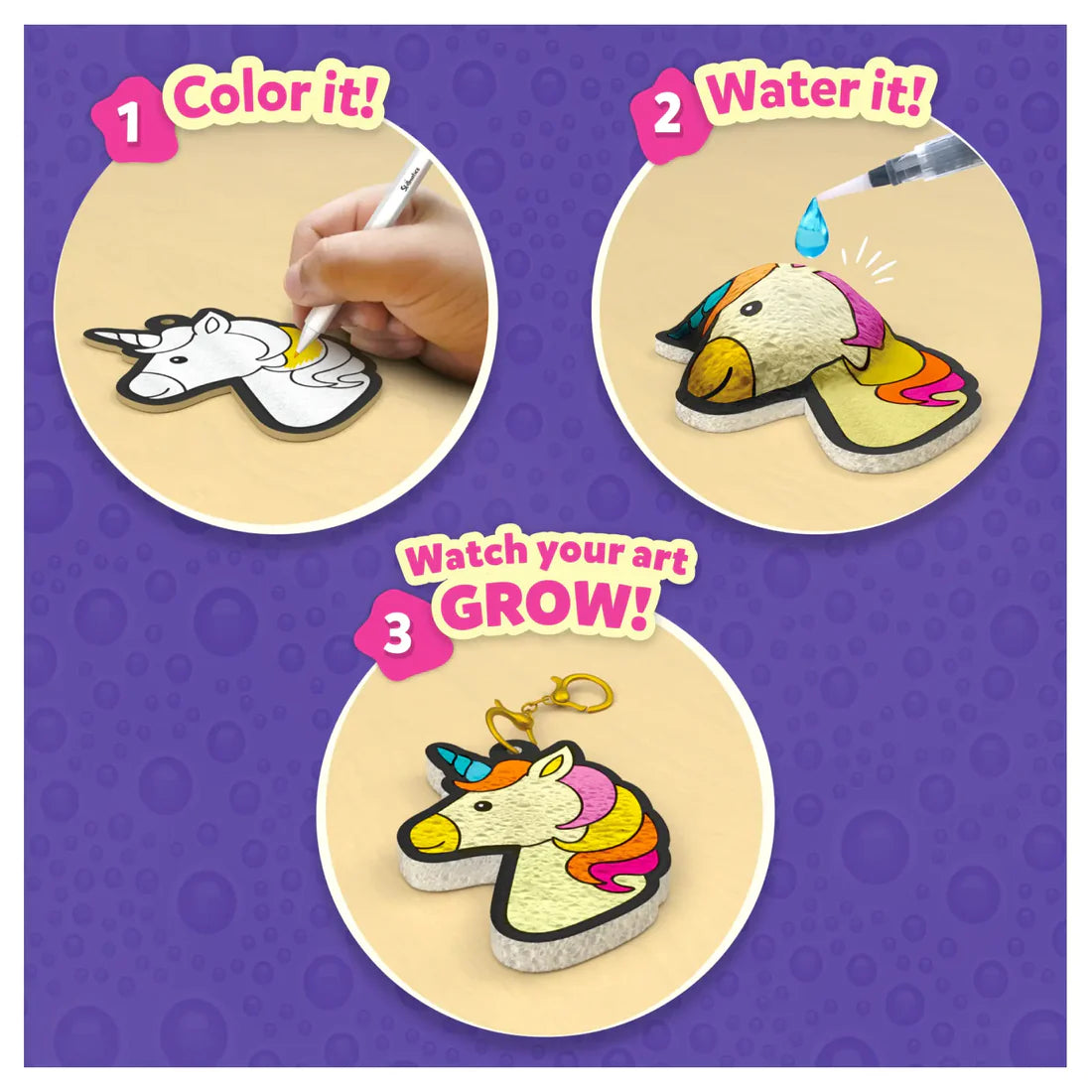 Color in adorable unicorns, princesses, and more - then just add water and watch your creations magically puff up! Once dry, loop some string or a keychain through the hole and use them as room decor or awesome accessories!