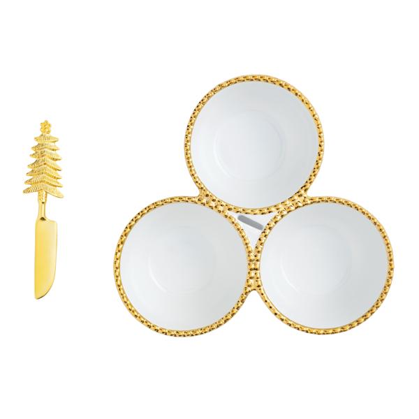 The Beaded Tree Triple Dip set is a stunning addition to any dining experience, offering both functionality and elegance. This 2-piece set includes a beautifully crafted mottled ceramic triple dip server, designed with exquisite electroplate beaded edges that add a touch of sophistication to your table setting. The server features a center groove specifically designed to hold the accompanying gold cast aluminum tree spreader, ensuring a seamless and stylish presentation. Measuring 5 inches by 9 inches, the server provides ample space for serving a variety of dips, sauces, or condiments, making it perfect for entertaining guests or enhancing everyday meals. The spreader, at 5 1/2 inches, is crafted for ease of use and complements the server with its elegant design. Made from durable stoneware, this set promises longevity and timeless appeal, making it a must-have for those who appreciate quality and style in their serveware collection.2-piece set. Mottled ceramic triple dip server features electroplate beaded edges and center groove to hold gold cast aluminum tree spreader.