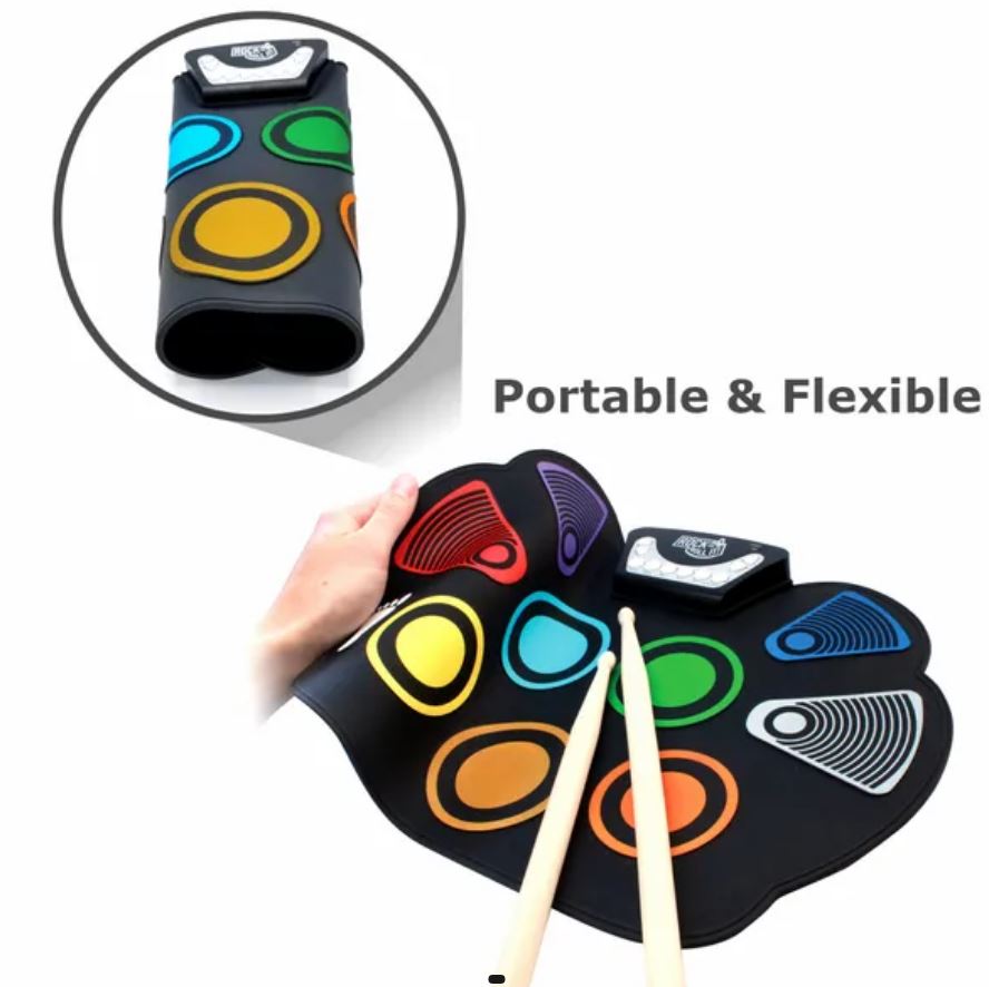 - LEARN TO PLAY THE DRUMS: Perfect for beginners- rock out then roll it up! Color coded set using a spectrum of color makes it easy to learn with included Music Book.