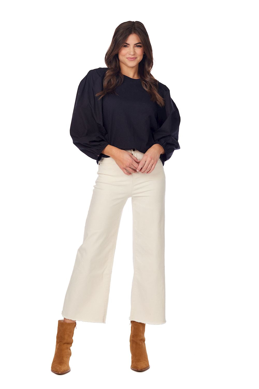 The cotton top features poplin three-quarter length balloon sleeves with elastic openings. Measures approximately 25" from shoulder to hem on size small.