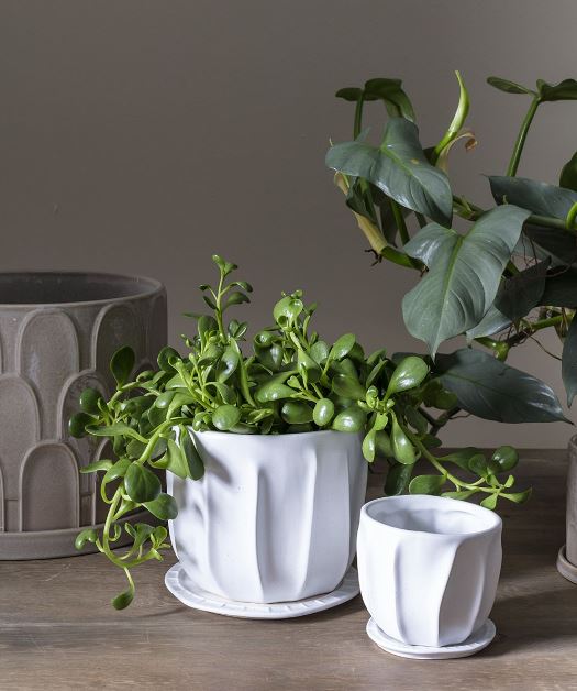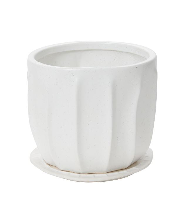 The Draken Pot features a smooth white finish with raised grooves to add organic style to a simple silhouette. A drainage hole and simple saucer make it an everyday staple with an extra dose of style.