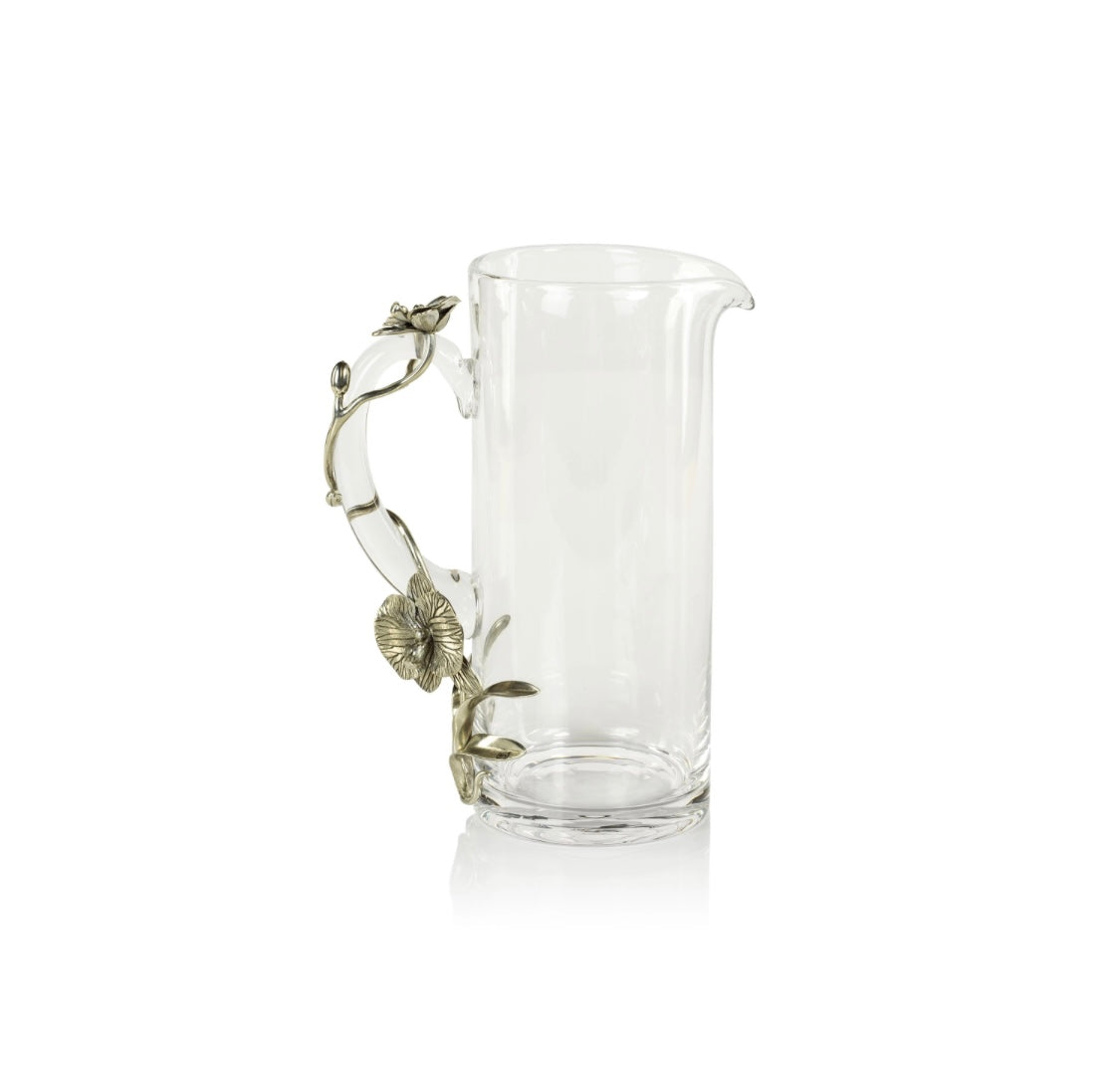 This decorative pitcher is a pewter and glass pitcher, ready to be admired and filled with cool drinks. Tall and slim it takes up only a small amount of table space yet imparts a large amount of style. High quality pewter is cast to create the sturdy intricately detailed orchid floral accents.