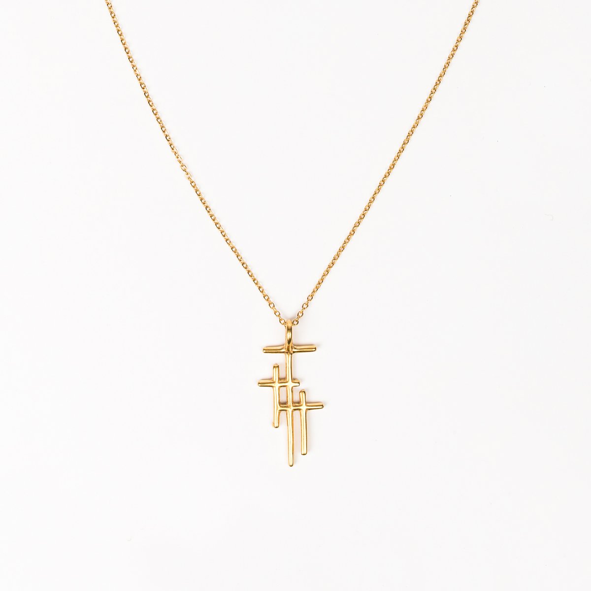 - 1-1/8" gold or silver-dipped three cross pendant designed exclusively by My Saint My Hero