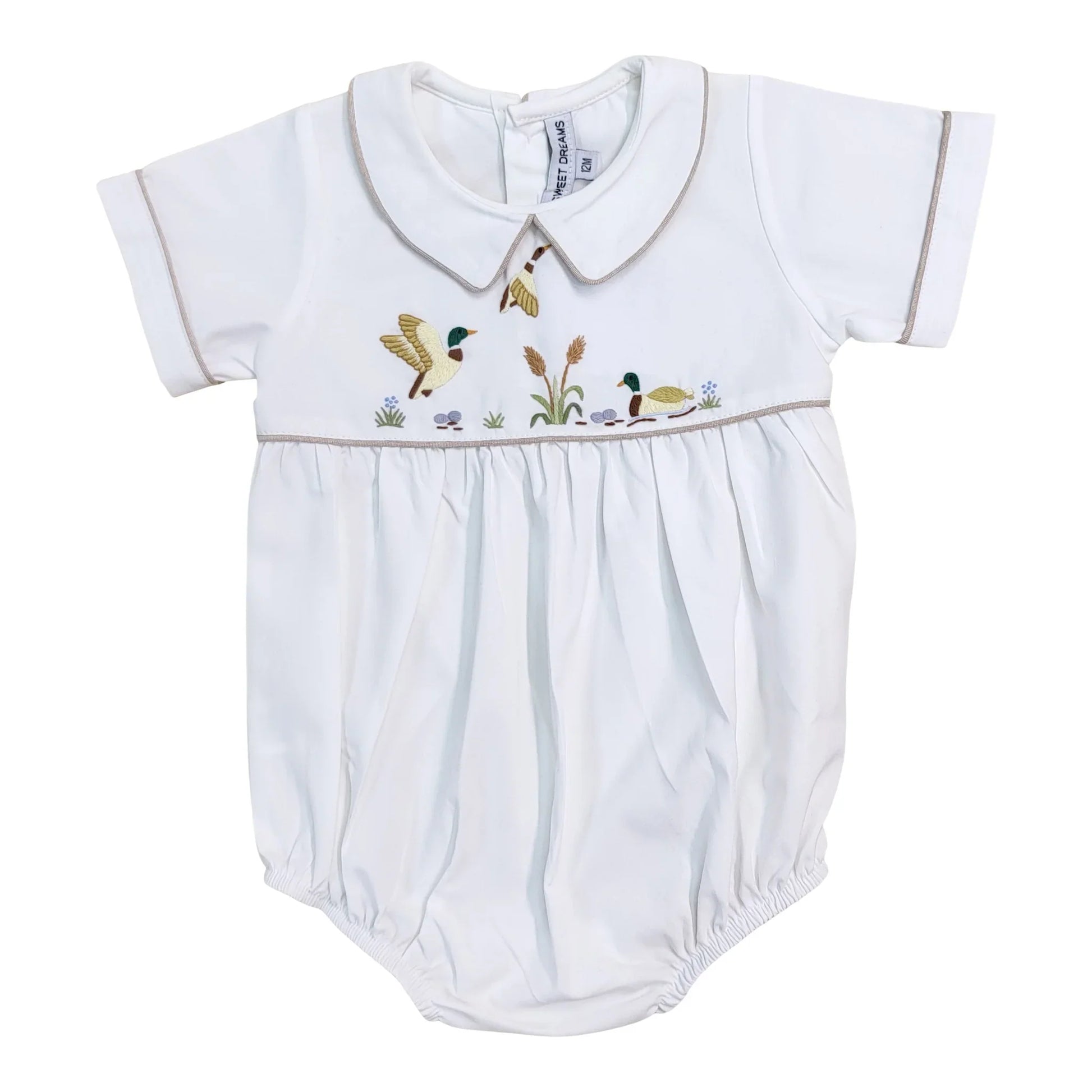 Introducing the Flying Mallard Embroidered Boy Bubble - the perfect outfit for your little adventurer! Made with soft, comfortable fabric and featuring a beautiful embroidered mallard, this bubble is perfect for your baby boy's active lifestyle. Get ready to soar to new heights with this adorable and practical outfit.