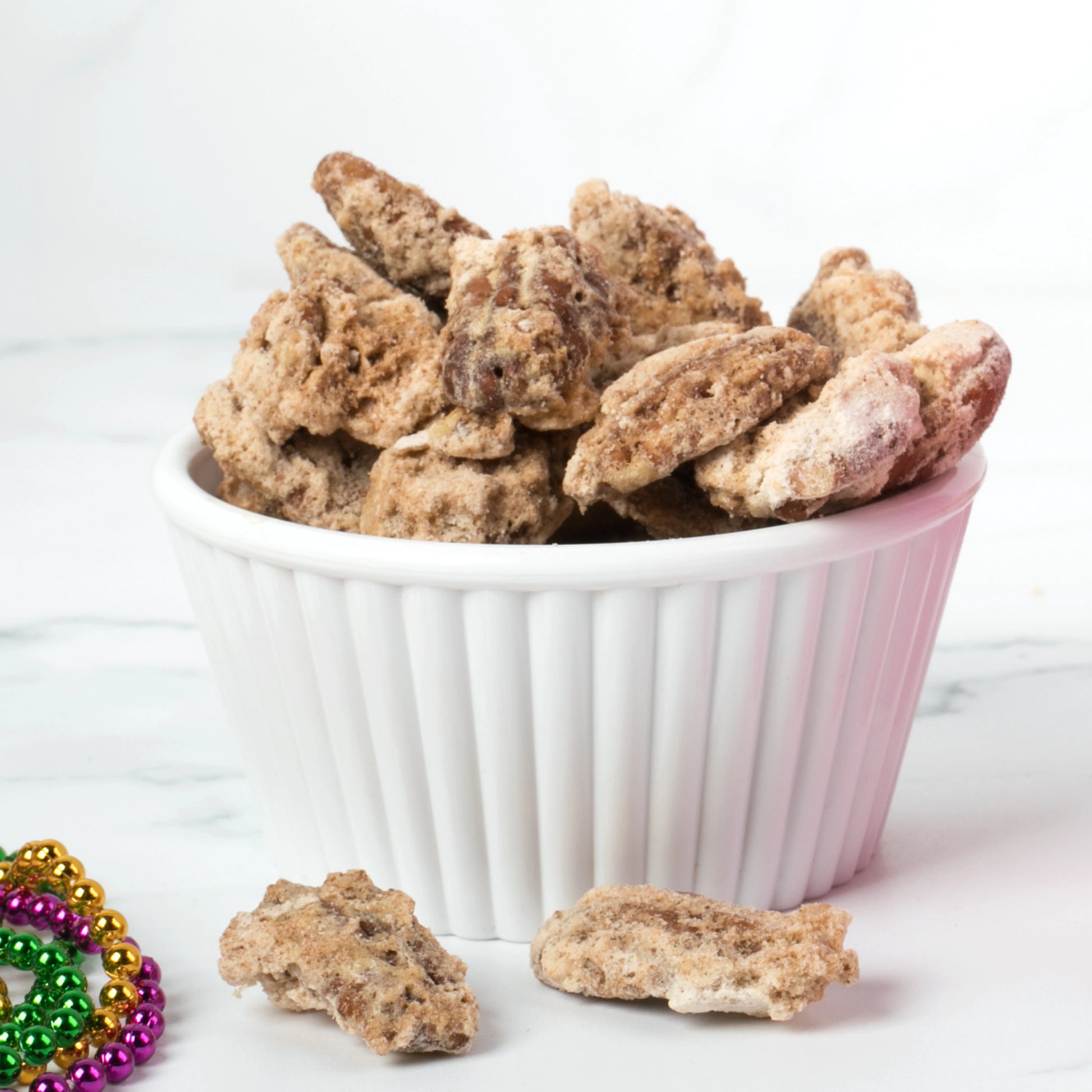 White Chocolate: White chocolate coated, meringue pecans