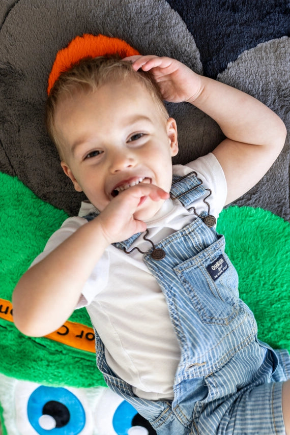 Grab a book and a snack and hitch a ride on our new Happy Tractor Inflatable Fluffy Floor Cushion! This jumbo four-foot floor pillow features a plush, ultra-soft cover in a classic green tractor design with a smiling cartoonish face, and a durable inflatable cushion insert made from heavy duty phthalate-free PVC. The cloud-like pillow is lightweight enough for little hands to move from room to room, yet strong enough to stand up to all sorts of activities – from more vigorous forms of play, to simply lounging and catching up on your favorite shows, games, and books. Set up is a breeze with the included high-efficiency air pump that inflates the inner core in minutes; and the removable, washable cover makes it easy to keep your cushion clean and the colors vibrant. Ages 3+