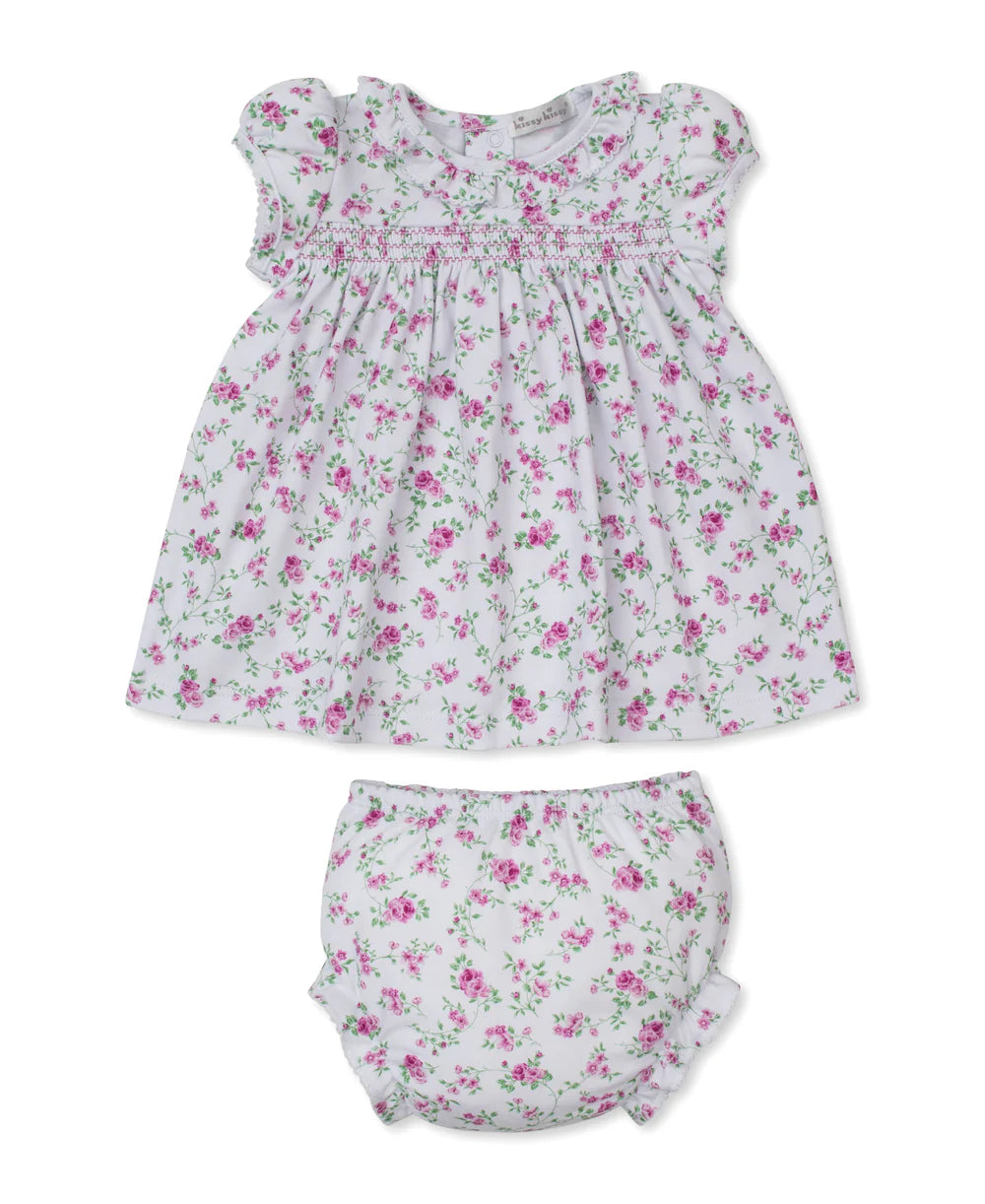 Our beautiful Victorian roses print covers this baby girls' smocked dress set, complete with a diaper cover. Made from 100% Pima cotton for and comfortable fit.