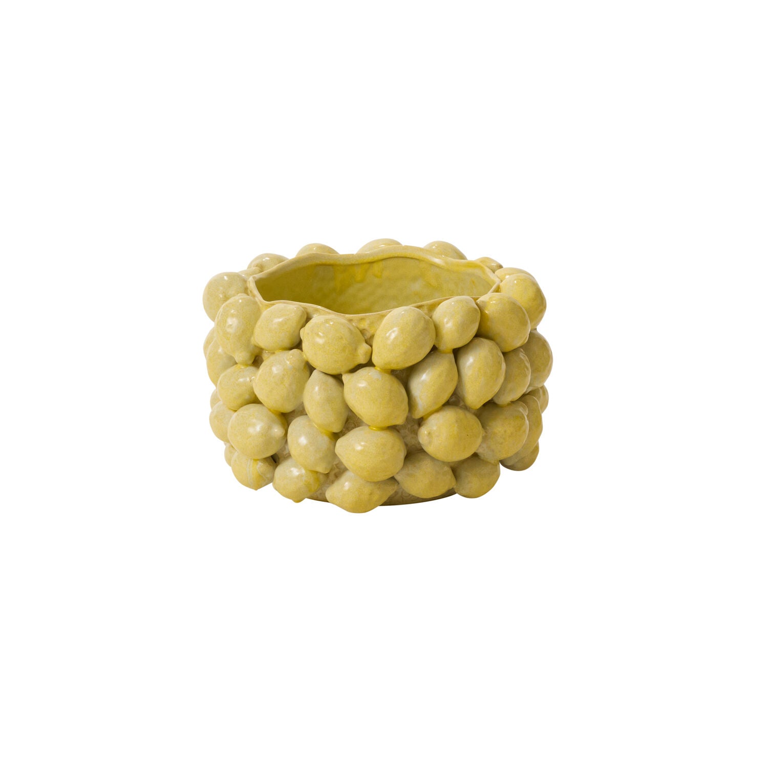 Your home decor has never experienced anything like the beautiful, dimensional ceramic Layered Lemon Pot. Playfulness meets elegance with these subtle, textured, handcrafted, & hand-applied lemons arranged closely together for full coverage on this unique vessel. The exterior & interior are finished in a yellow matte reactive glaze. Add an 8-inch drop-in plant to this large pot & display in a sunny kitchen window.