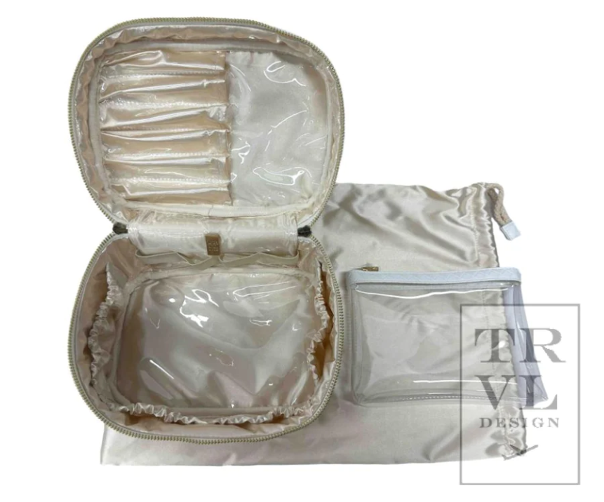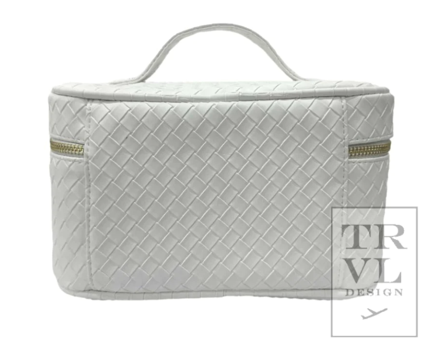 Introducing our new larger Train Case, our Train2 case - crafted in vegan woven leather with an interior made with our coated liquid gold liner that is completely wipeable - built for the beauty product lover! We added more height to the case to fit all your favorite things, including brushes in the lid. Featured with a top handle, a 2-way gold logo zipper puller, an inside removable clear pouch, elastic pockets around the bast and elastic loops on the backwall and a gold dust bag