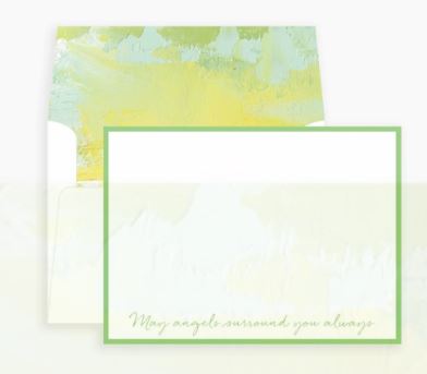 Whether you are sending a note of congratulations, encouragement or sympathy, our May Angels Surround You Always notecards are perfectly designed in their simplicity and are ideal for sharing your thoughts with beauty and flair. These notecards are available in green, pink, orange or blue. Each comes with matching envelopes featuring Anne Neilson’s artwork printed inside.