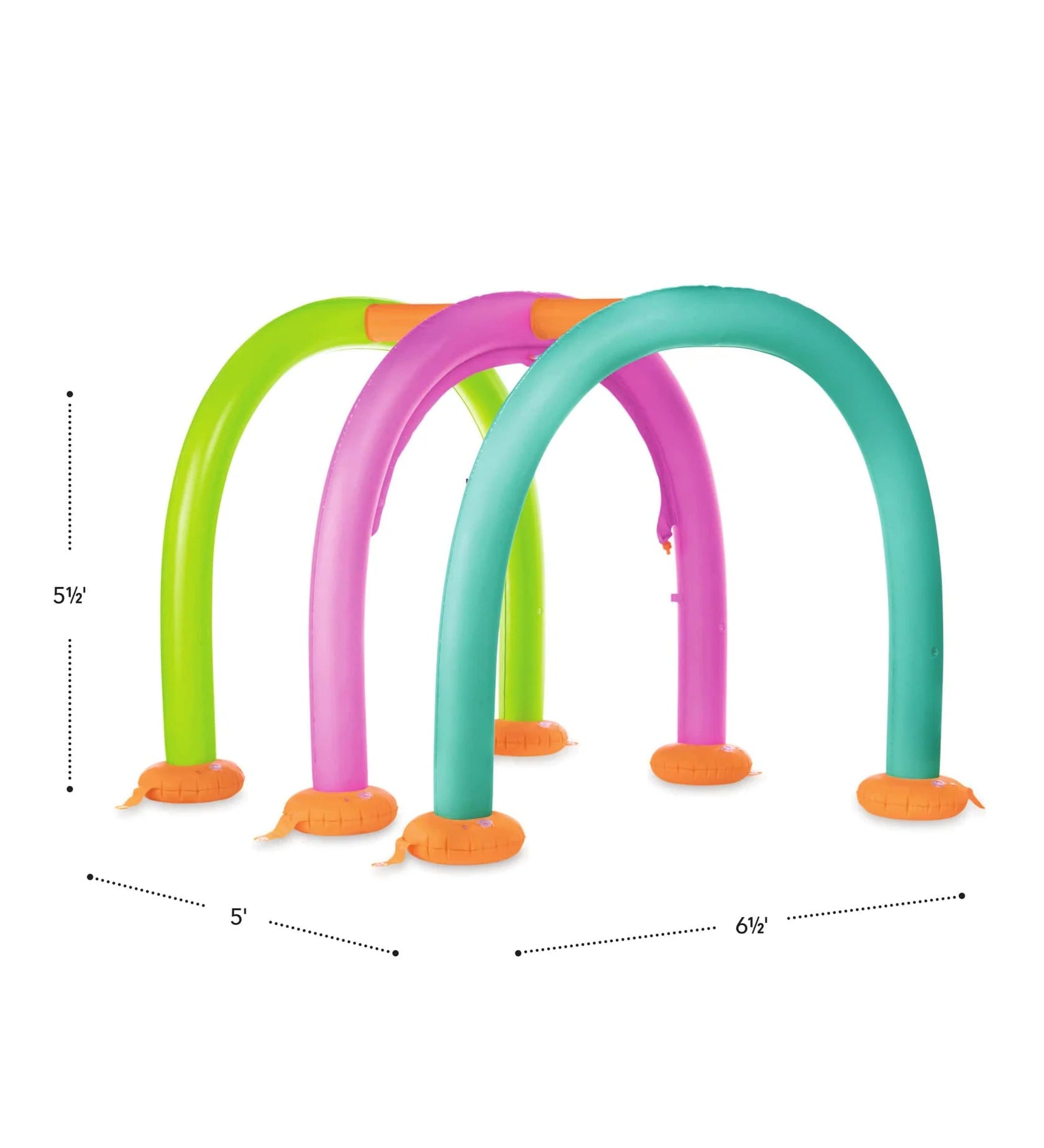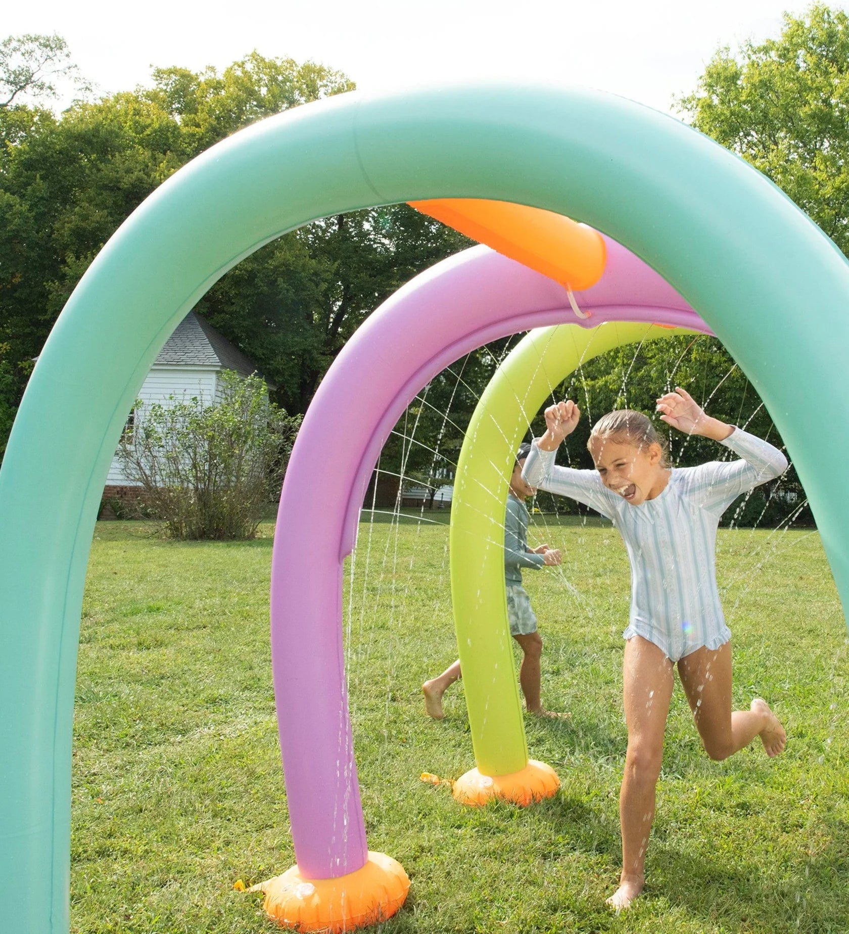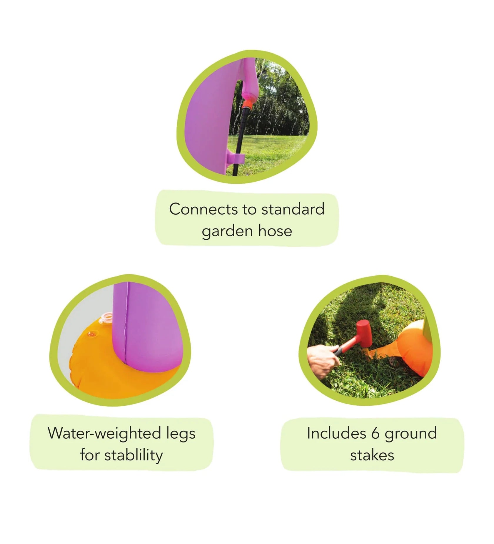 This towering multicolor sprinkler stands 5.5 feet tall and provides hours of fun for kids and adults alike. Made from durable vinyl with water-weighted legs and ground stakes for added stability, it’s easy to set up using a standard garden hose.