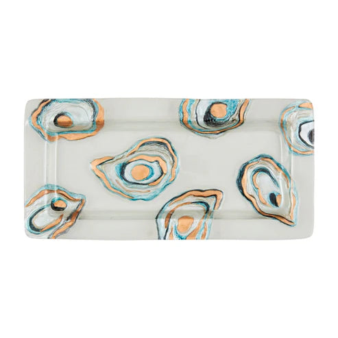 Glass Oyster Platter. This exquisite hand-painted glass platter is a stunning addition to any dining experience. Measuring 7 1/4" x 15", it offers ample space for serving a variety of dishes, from fresh oysters to an array of appetizers. The intricate design and vibrant colors make it a captivating centerpiece, perfect for entertaining guests or enhancing your home decor. Crafted with care, this platter combines functionality with artistic elegance, making it a must-have for those who appreciate fine craftsmanship and unique tableware.
