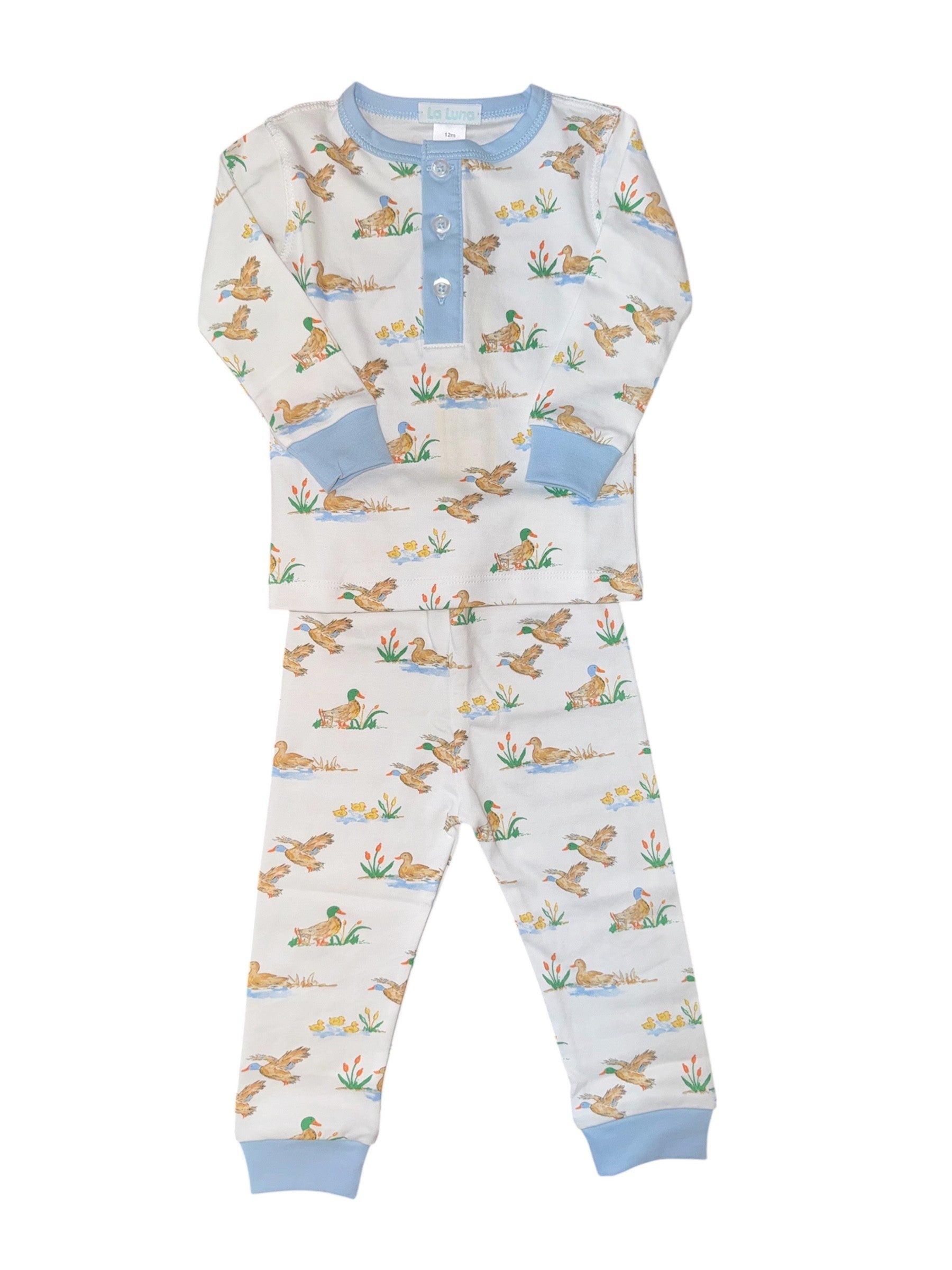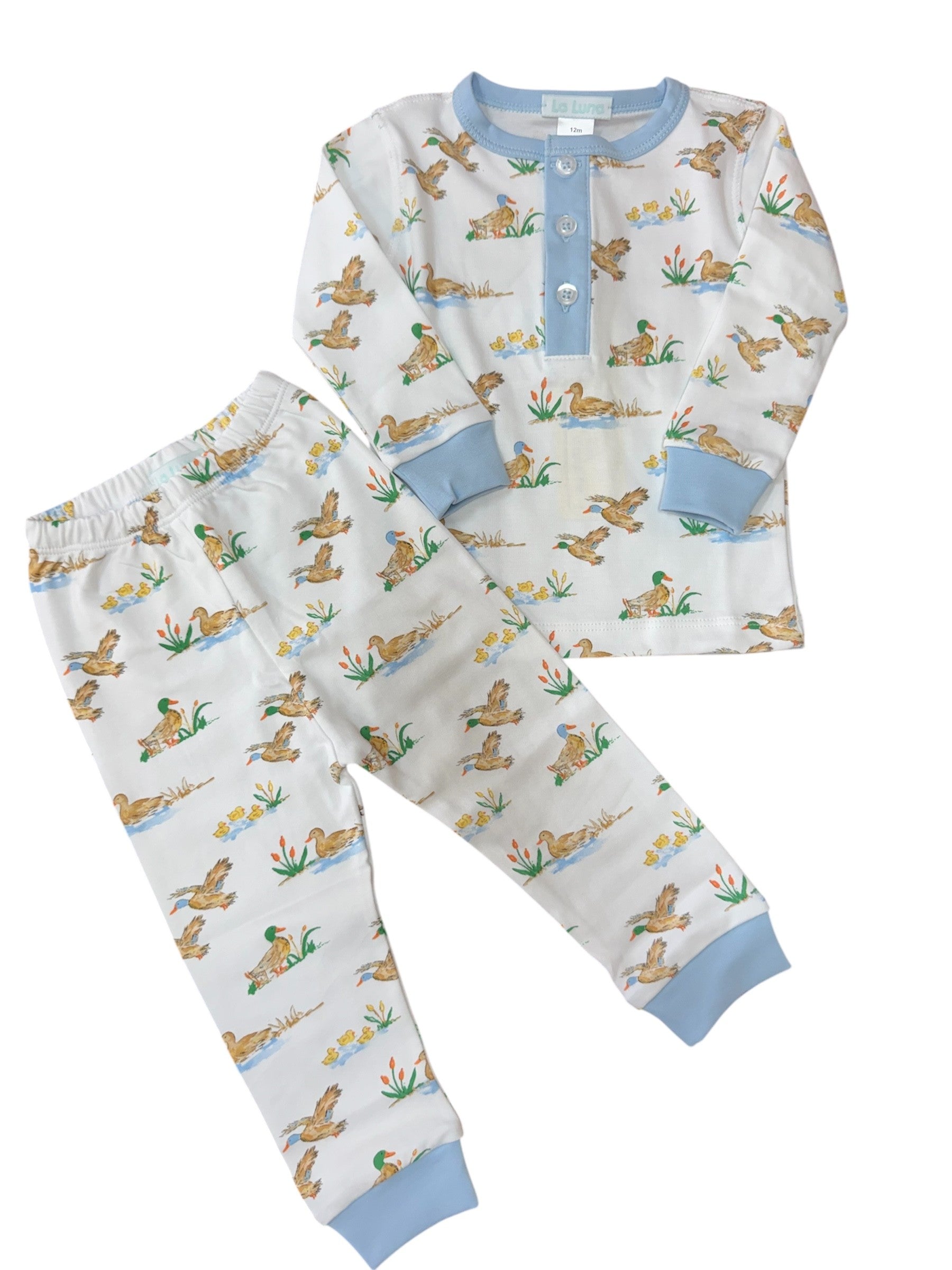 This cozy Pima cotton pajama set is a must-have for your little one’s bedtime routine! Featuring a playful, vintage-inspired print of ducks and blooming flowers, it’s as cute as it is comfortable. The set includes a long-sleeve top with soft ribbed cuffs at the wrists and ankles, offering a snug and secure fit. The matching pants have an elastic waistband for easy wear and maximum comfort. Made from ultra-soft, breathable Pima cotton, this set is gentle on sensitive skin, ensuring your child stays comfortable all night long.