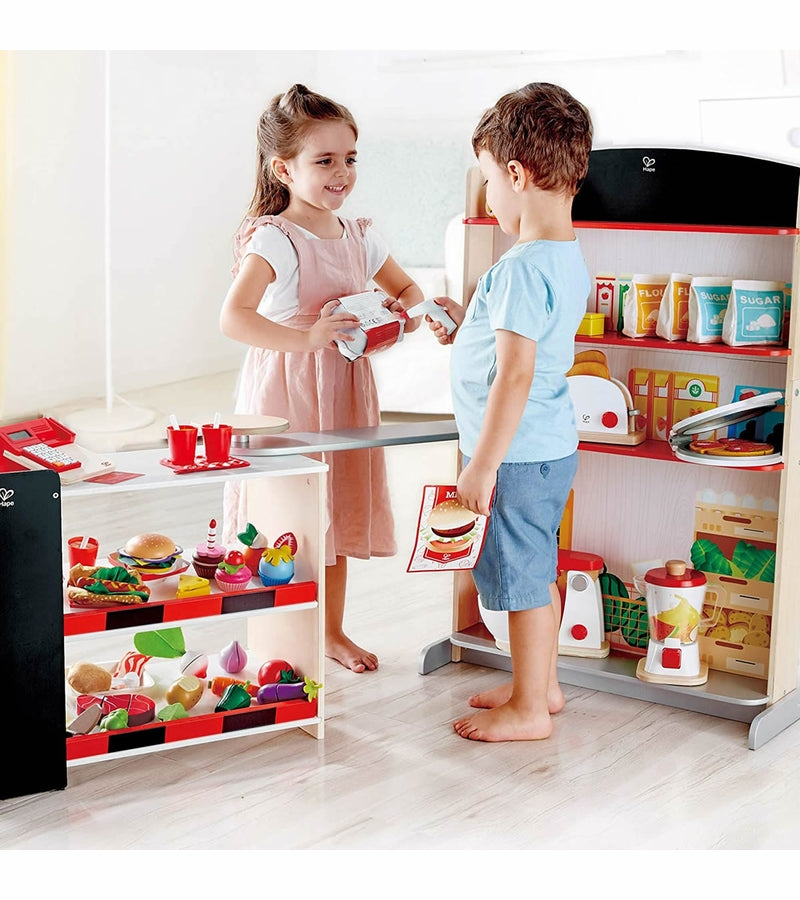 Blip, blip, blip! This realistic Pop-up Shop includes a handheld scanner that beeps and flashes when you press the button on its back. Use the calculator to total your customers’ purchases, then listen for the reassuring beep as they swipe their cards.