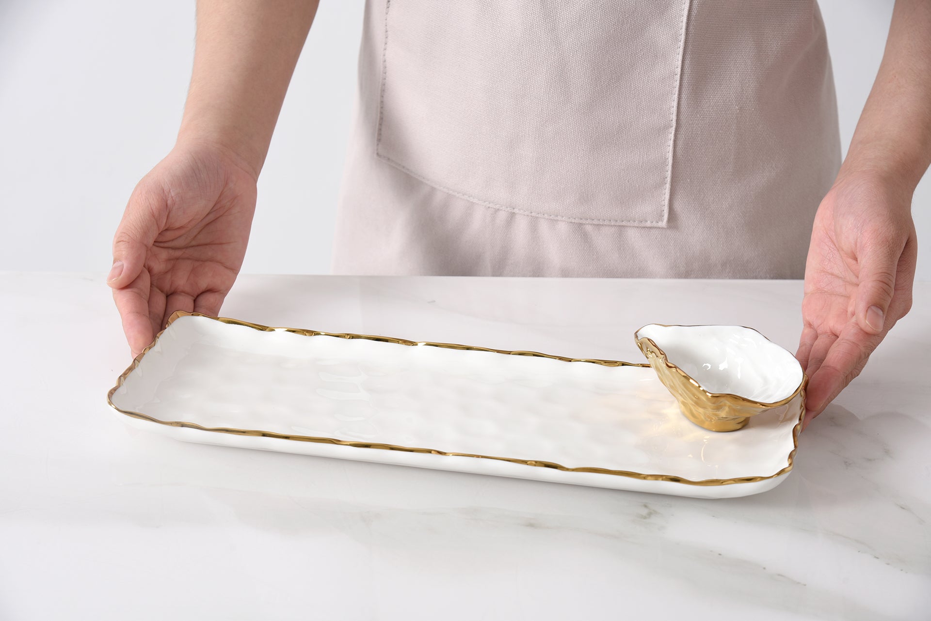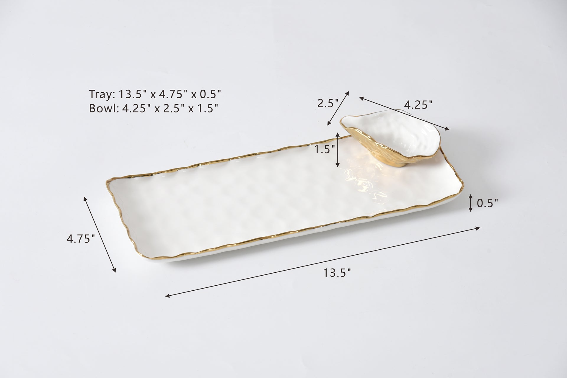 Enjoy homemade or takeout sushi in style with our Sushi Tray with Mini Oyster Bowl from our Portofino collection. Get creative and use for more than just sushi: perfect for cheese and crackers, veggies, dried fruits and nuts. Gorgeous white porcelain tray with a delicate gold trim. Bowl crafted in a stunning high-fired porcelain with gold finished exterior. Food safe, tarnish free, dishwasher safe, oven safe to 500°. Easy Care.