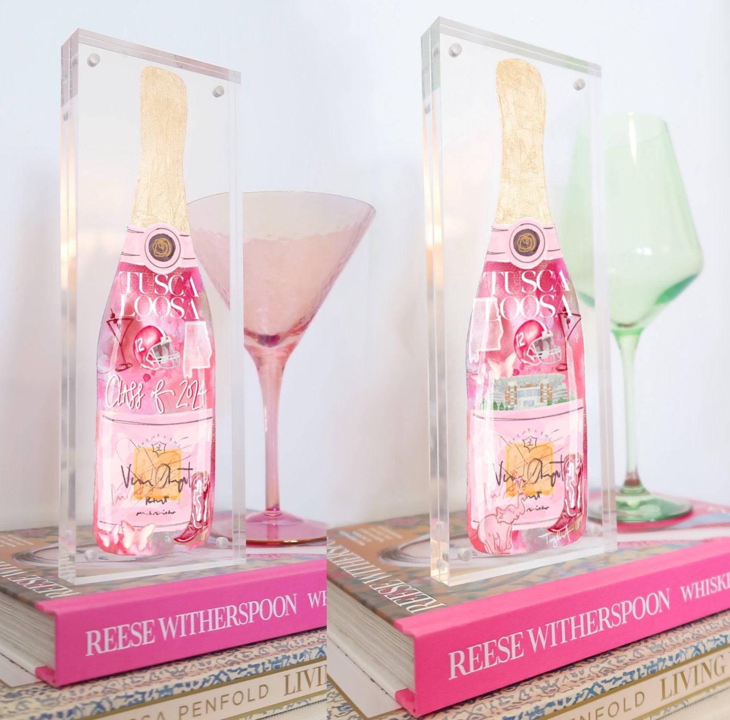 Introducing the Acrylic Bottle Art! This unique 3.5” x 9” acrylic magnetic frame features a colorful abstract design and a shiny gold leaf bottle top. It's the perfect gift for any 2024 graduate or LSU/Alabama lover!