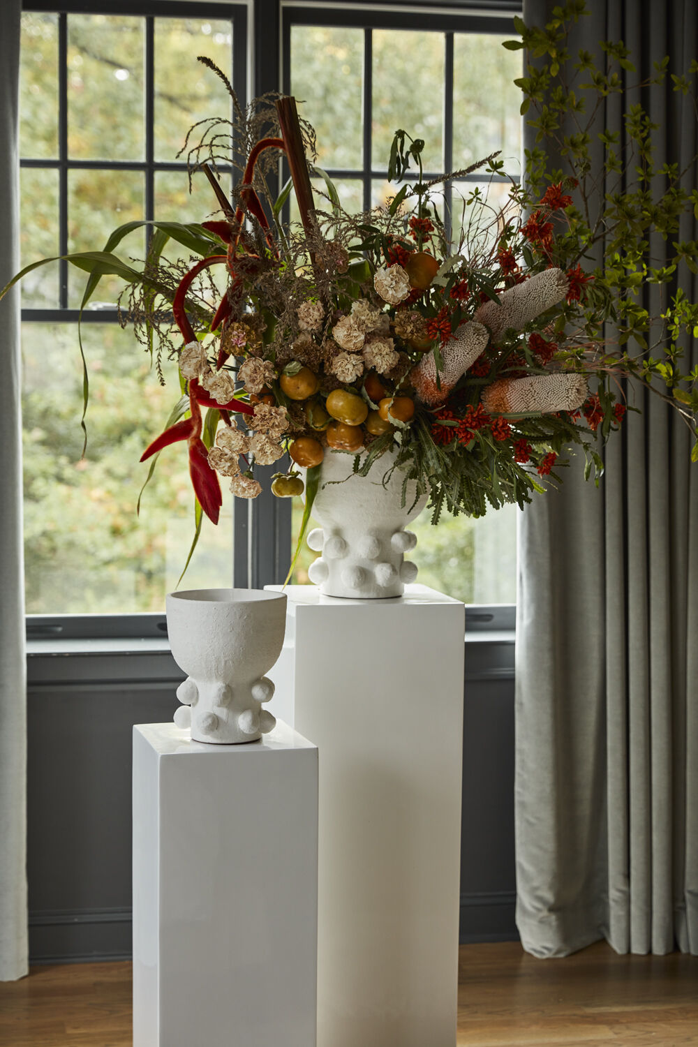 Though clean & neutral in color, the large terracotta Proton Footed Pot is anything but subtle with its sculptural design, footed design, & dimensional spheres around the base. With a painted matte white finish, this watertight pot makes an artful decorative accent or centerpiece. This trendy vessel is perfect for home & gift retail or modern plant shops.
