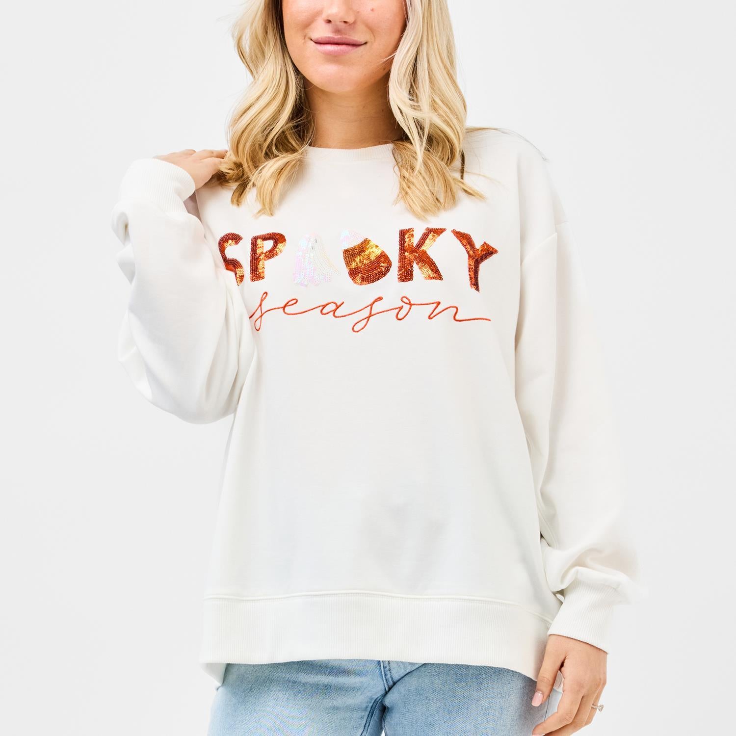 Celebrate spooky season in style with the Spooky Season Sweatshirt—a playful yet polished nod to everyone’s favorite frightful time of year. Featuring shimmering sequin letters that spell out “Spooky” (complete with a ghost cameo!) and “season” embroidered in vibrant orange script, this cozy white pullover adds just the right amount of sparkle to your fall wardrobe.