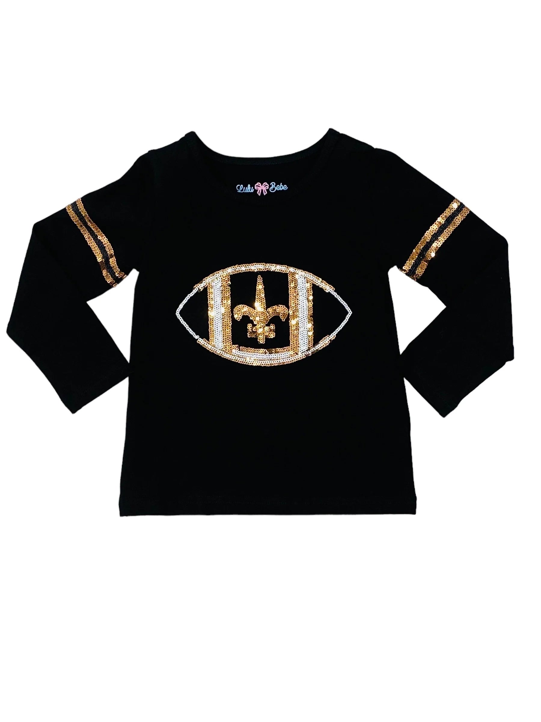 Have your little one be the hit of the party in this "who dat" Sequin Black and Gold Tee! Let your Saints pride sparkle and shine in this ultra-glamorous piece. Perfect for game days and beyond. Who dat? You dat!