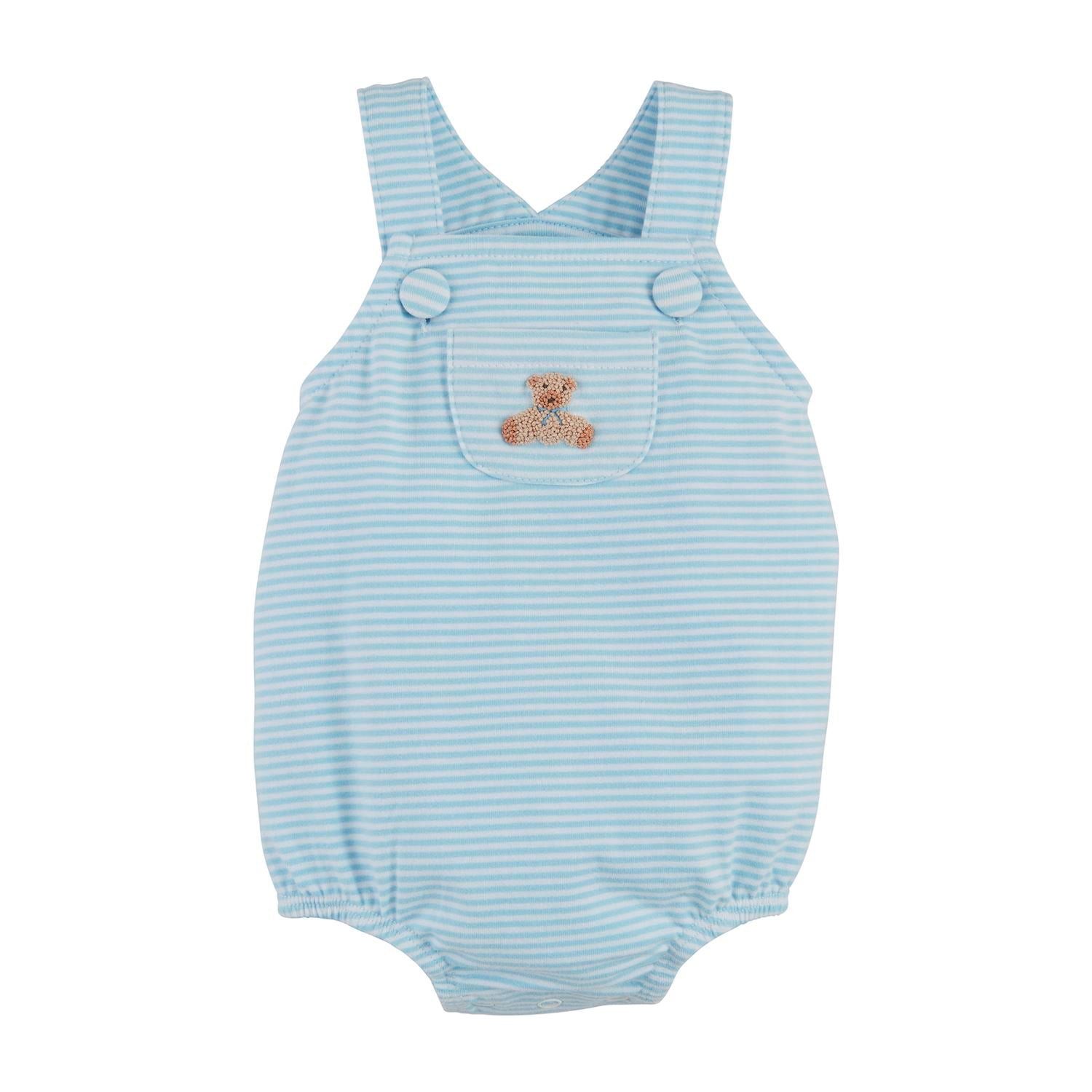 Jersey bubble features front pocket with French knot embroidery. Inner leg snaps.