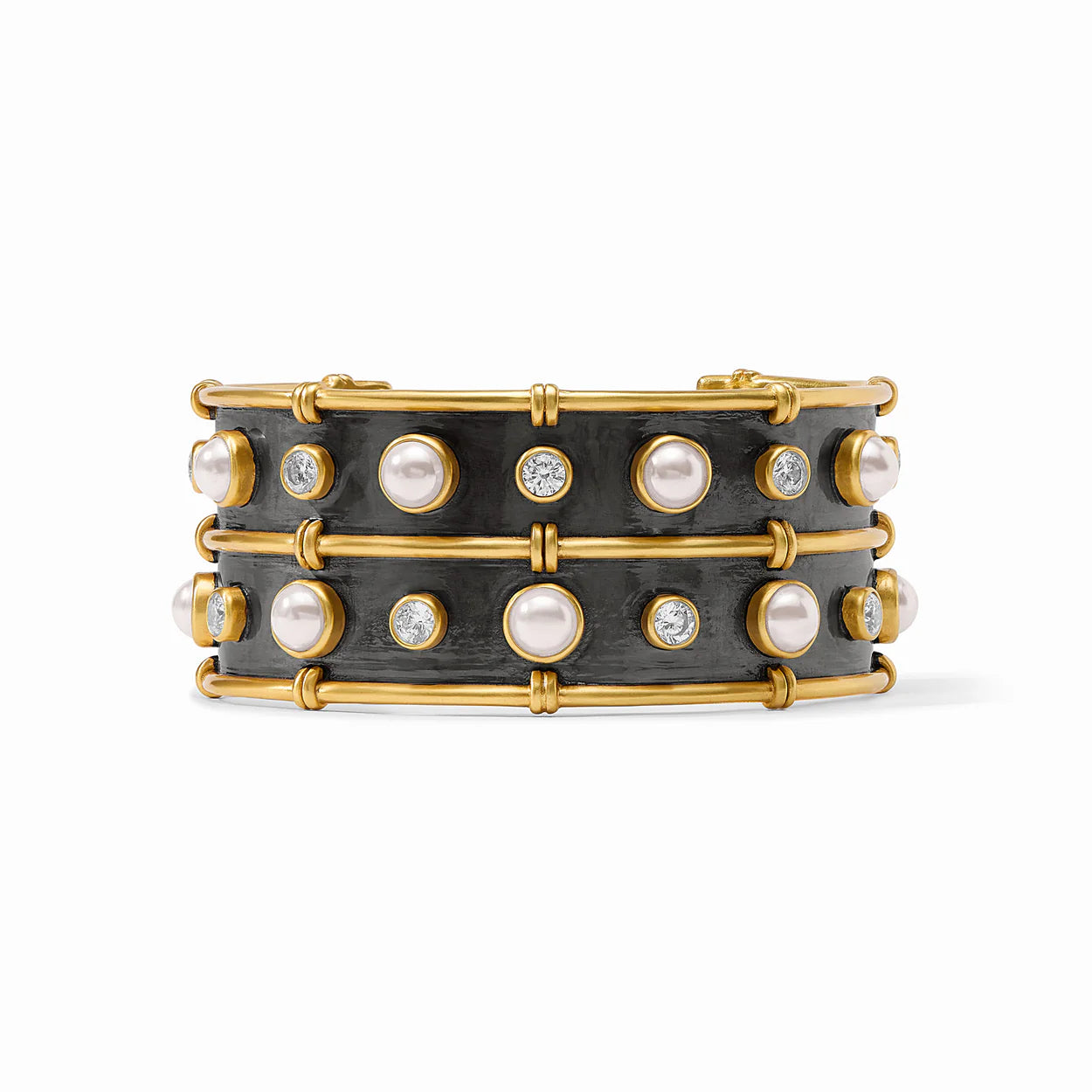Bold and beautiful, the Tribeca Cuff features a wide 1.2″ cuff band set with shell pearls and sparkling CZ stones. Inner circumference is 7.8″ and the hinged design makes it easy to wear. Julie Vos hallmark etched inside.