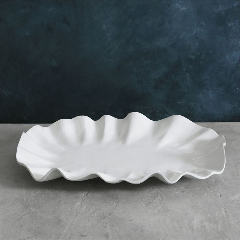 VIDA Bloom Large Oval Platter in luxury melamine. With rippling petal-like movement, the dynamically designed serving platter combines beauty, artistry and functionality. Perfect for serving a variety of foods in style, the sensational design will elevate any gathering. Presented in a glistening white melamine with the look of ceramics. Dishwasher safe (top rack), heavy-weight, break resistant and durable, food safe, BPA and PABA free.
